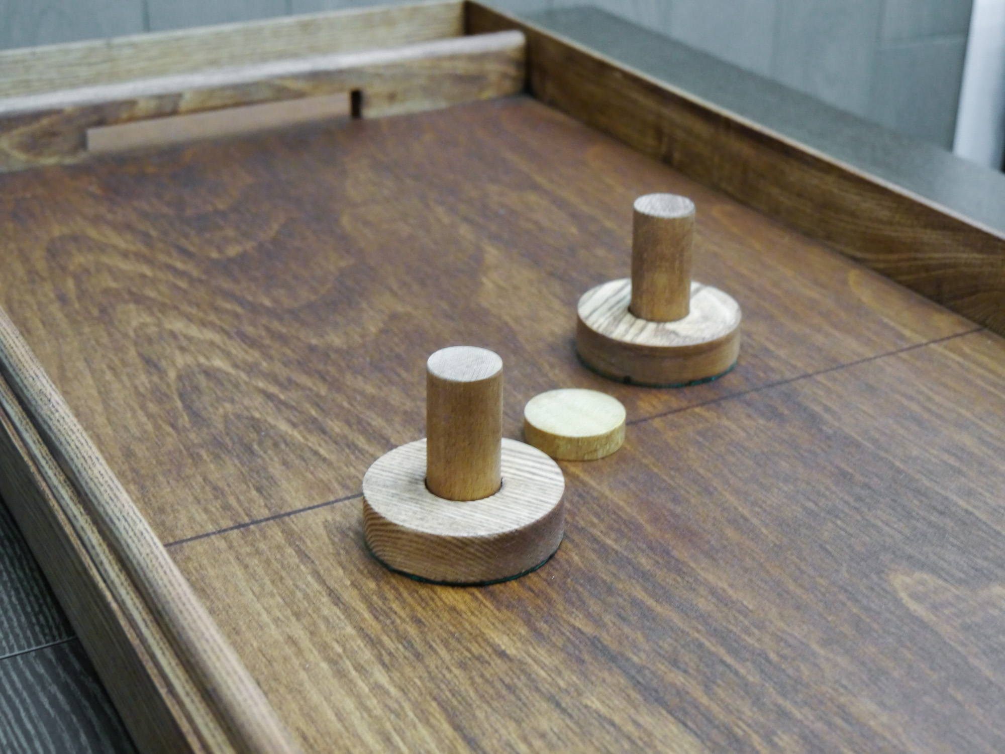 Drewniany air hockey bez prądu. Woskowana powierzchnia, ślizgające się krążki z bukszpanu, szybkie i wciągające partie dla dwóch graczy.